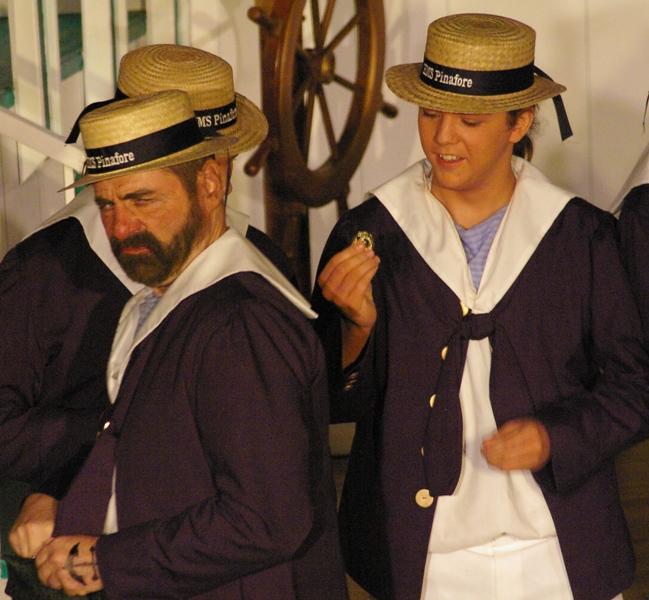 HMS Pinafore takes place fully on the ship, the HMS Pinafore. The original Pinafore, that the name of the show was based on, was a large ship colored in bright orange and black. To save your eyes and ours, we have gone with a much cooler palette for the set.