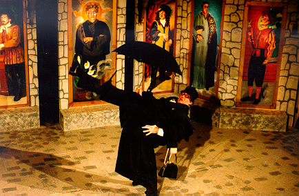 In the original production of Ruddigore, Gilbert called the men in Act I a "chorus of Bucks and Blades," and dressed them in military regalia. We've moved the period of the piece from early 19th to early 20th century, and have altered the character of the men's chorus, as well; we call our group of weekend sportsmen "chorus of Upper-class Twits".
